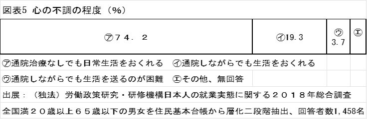 心の不調の程度調査(図表5)では「通院しながら生活(19.3%)」「通院しながらでも生活が困難(3.7%)」となっています。