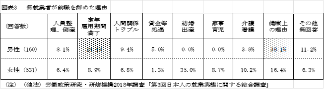 就業経験のある無就業者(有効回答数4,409人)が仕事を辞めた大きな割合を占めているのは、男性では「健康上の理由(38.1%)、「定年・雇用期間満了」が24.4%です(図表3)。健康上の理由を年齢別にみると男性は20代から50代まで一貫して高く(40代50.0%、50代57.1%など)、女性は40代(37.7%)で特に高まる傾向があります。(労働政策研究・研修機構調査)。