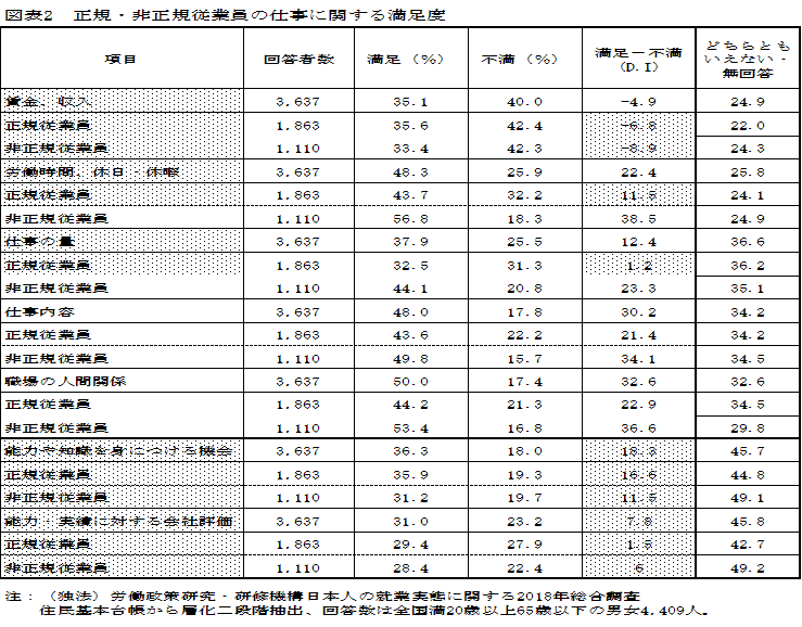 図表2は従業員の労働条件環境項目に対する満足度調査結果です。正規従業員が不満に思っている割合の高い項目の順で見ますと、「賃金、収入」「仕事の量<1.2>」「能 力・実績に対する会社評価<1.5>」「労働時間、休日・休養<11.5>」「能力や知識を身につける機会<16.6>」となっています。非正規従業員が不満に思っている高い項目は「賃金、収入<-8.9>」「会社評価<6>」「能力知識を身に着ける機会<11.5>」です。他の項目は満足の割合が正規社員よりも高くなっています。