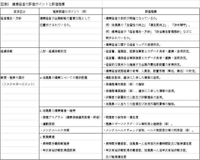 上述の社会環境の変化に伴い、メンタル(ストレス)チェックの結果分析をいかして、心の健康を保持増進できる職場環境づくりの活動が大切になります。図表8は健康経営の評価ポイントと評価指標の一例です。評価指標の調査方法は厚生労働省「健康投資管理会計ガイドライン」に例示されています。