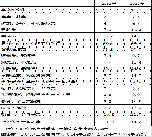厚生労働省「労働安全衛生調査(実態調査)」によると、健康上の理由では、メンタル不調が高くなっています。メンタル不調が原因で連続1か月以上休業又は退職者のいる事業所割合は、2022年13.1%(2012年8.1%)と10年前と比べ上昇しています。休業、退職者の割合の高い事業者は「電気ガス水道業」「情報通信業」「金融保険業」「学術・技術等専門サービス業」です(図表4)。
