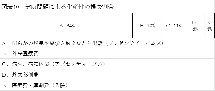 図表10は健康問題による生産性の損失割合を日本企業4社で働く労働者12,350人に対して実施した調査データによると、損失の割合は、A.(プレゼンティーイズム)が大きく、発症要因は筋・骨格系の問題、こころの不調、目が関連しているとあります(「健康経営を科学する」<大修館書店>)。