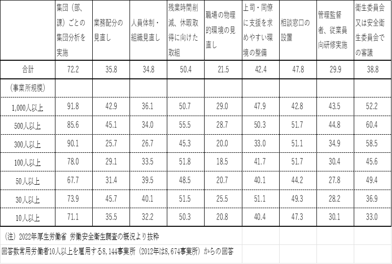 常時50人以上の労働者を使用する事業場はストレスチェックの実施が義務づけられ、50人未満企業についても2025年5月以降3年間の猶予期間を設けられていますが、義務化されました。企業がストレスチェック結果にもとづき行ったことは、①残業時間減・休暇取得推進、②相談窓口・上司、同僚からの支援環境づくり③安全衛生委員会審議にデータを活用するなどです(図表9)。