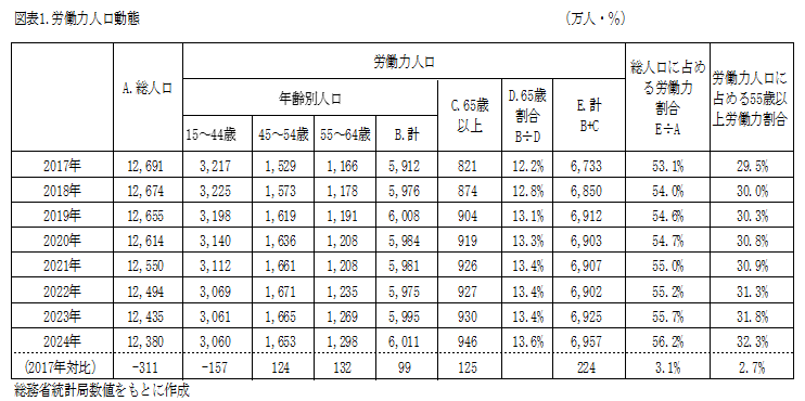 2017年と比較すると、2024年の国内総人口は311万人減少しているが、労働人口は224万人増加しています。内訳をみると44歳以下では157万人の減少している一方、45歳以上で381万人増加したことが要因です。現在、労働力人口に占める55歳以上の割合は32%となっている状況にあり、職場における高齢化が進んでいます。