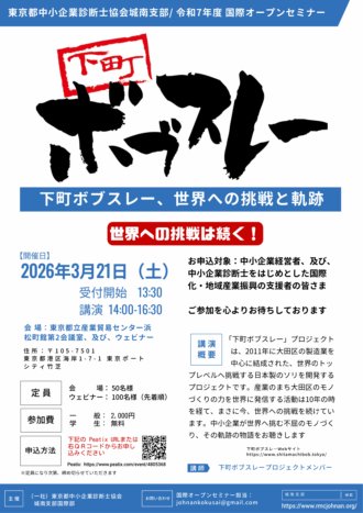 本講演では、こうした国際舞台への挑戦を可能にした技術力、中小企業同士の連携、そして困難に直面しながらも挑戦を続ける姿勢について、具体的な事例を交えてお話しいただく予定です。